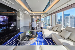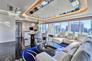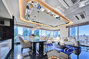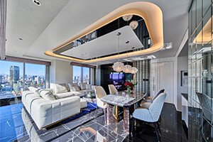 黒を基調に鏡面タイルや石材を取り入れ、天井ミラーや幾何学模様の壁で近未来的な要素をアクセントとして加えています。一方で、曲線的な照明ラインで柔らかさを添え、格式のあるヨーロッパ家具を合わせて、気品と高級感を演出。鮮やかなブルーのラグが、開口部に広がる抜けるような青空とリンクします。