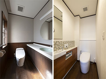 既存の建物のイメージを一新したいというご要望をお受けし、レストルームもデザイン性の高い空間を目指しました。コンセプトは「上質なコントラスト」。ひとつはダークカラーを基調としたシックで落ち着いた空間、もうひとつは白を基調とした明るく清潔感のある空間に。異なるインテリアに仕上げることで、雰囲気の違いを楽しめます。どちらの空間にもカッティングガラスが美しい洗面ボウルを採用し、光の反射がきらめくアート性の高い空間としました。オーナーが希望する「ハイセンスな空間」を叶えたリフォームです。