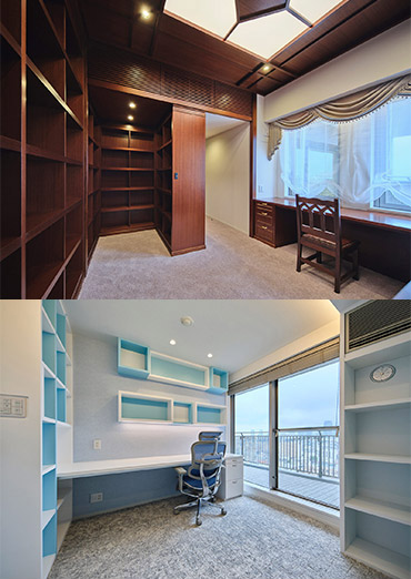 奥様には、ヨーロッパの図書館を思わせるクラシカルな書斎。重厚感のある素材と落ち着いた色調が、思索を深める上質な空間を演出します。ご主人の書斎はブルーとホワイトを基調にしたシンプルモダン。爽やかで整った空気感が、集中力を高める快適なワークスペースです。