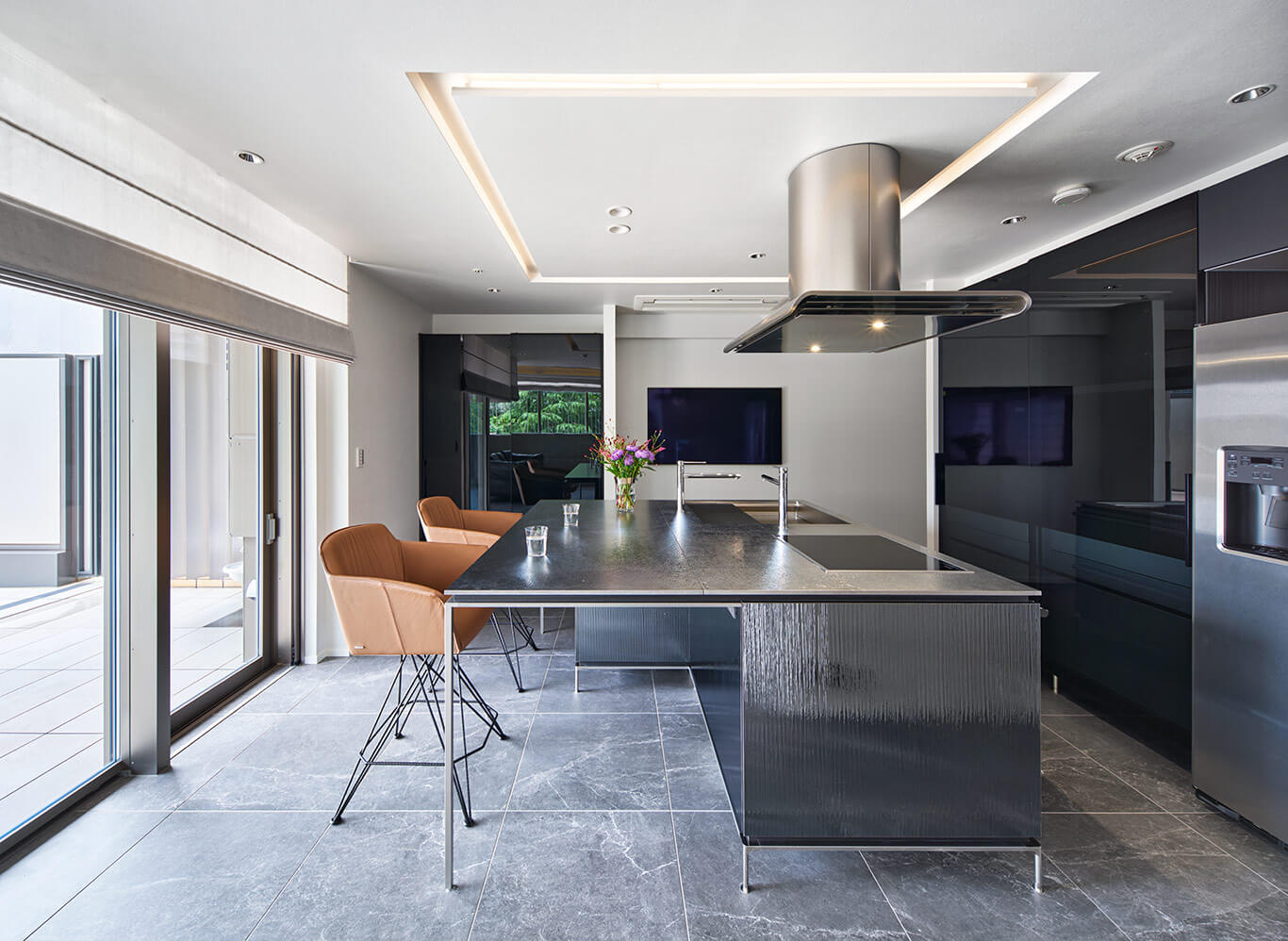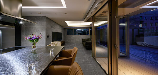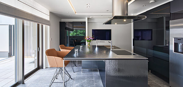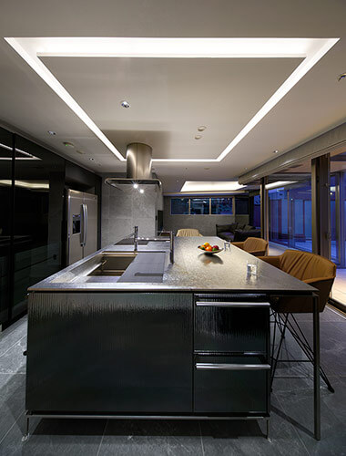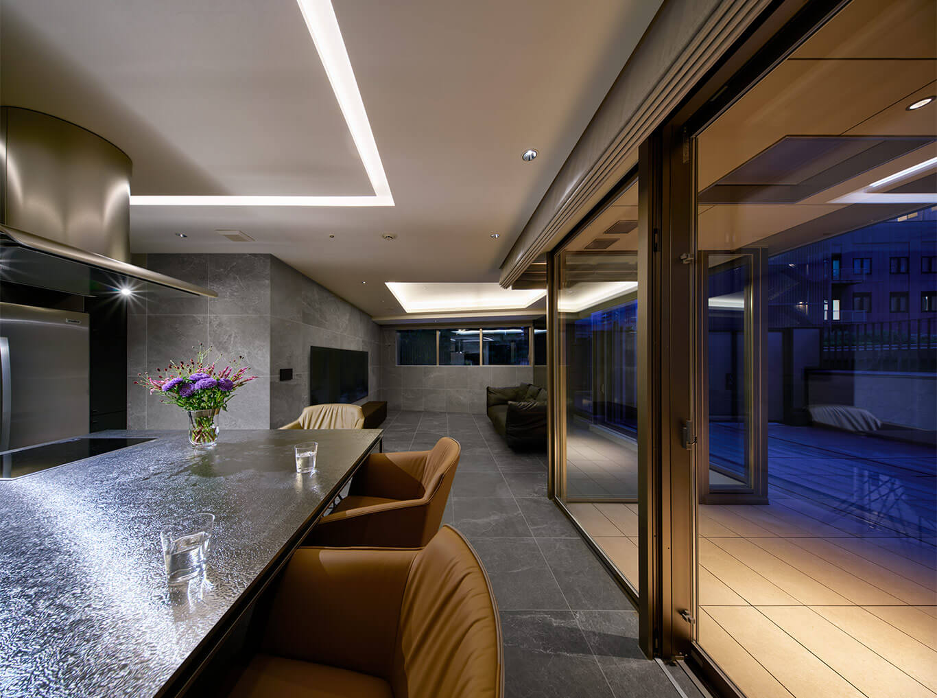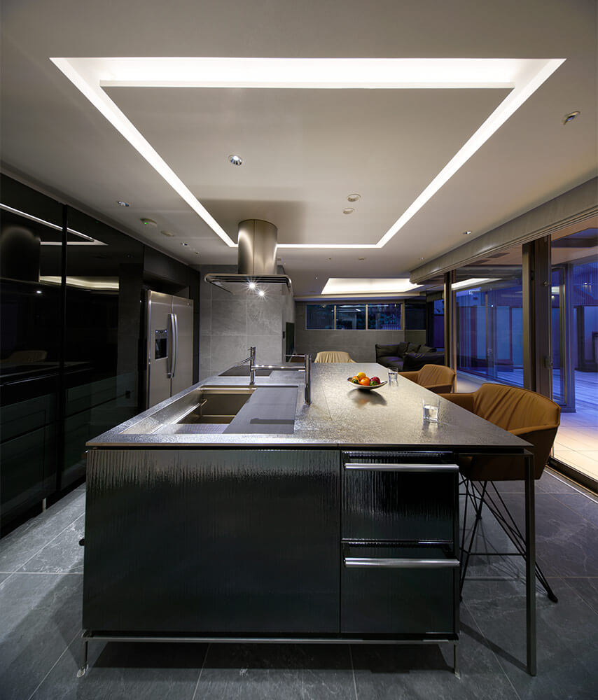 流氷をイメージしたワークトップの陰影が、夜のひと時に静かな輝きを添える