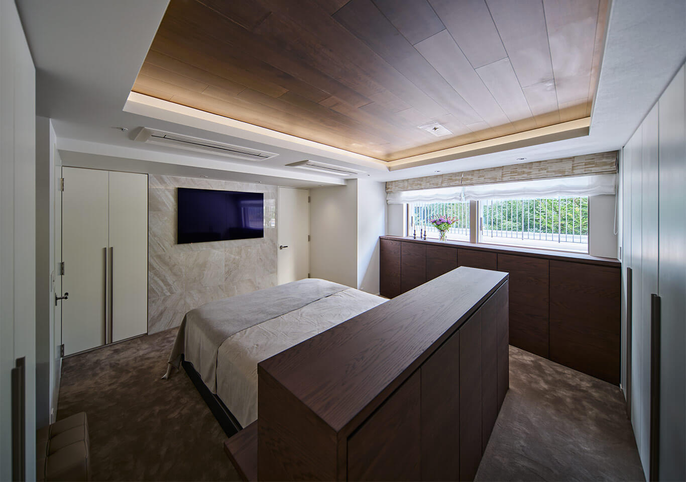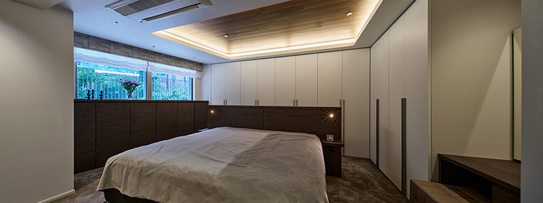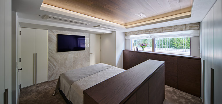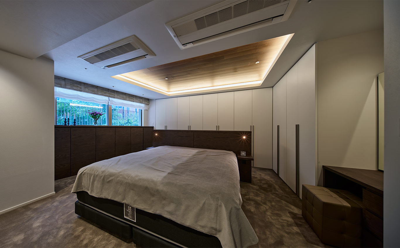 既存の3LDKの間取りをライフスタイルに合わせて再構築。3つの洋室をゆとりある主寝室とし、納戸を新設しました。主寝室には大容量の壁面収納を備え、一角にドレッサーも設けています。キッチンはご夫婦が夜にグラスを傾けるシーンを想定し、ダイニングテーブルも兼ねたタイプに。流氷を思わせる陰影が美しいステンレス製のワークトップでミニマルな空間に華やぎを添え、スタイリッシュな日常を支える住まいへと生まれ変わりました。