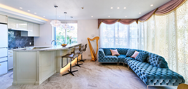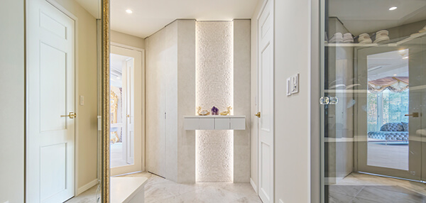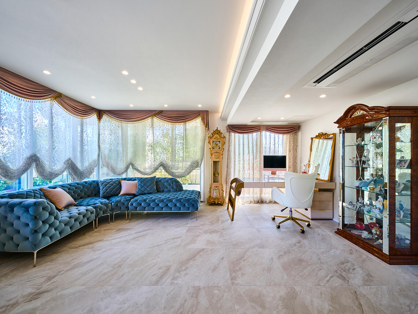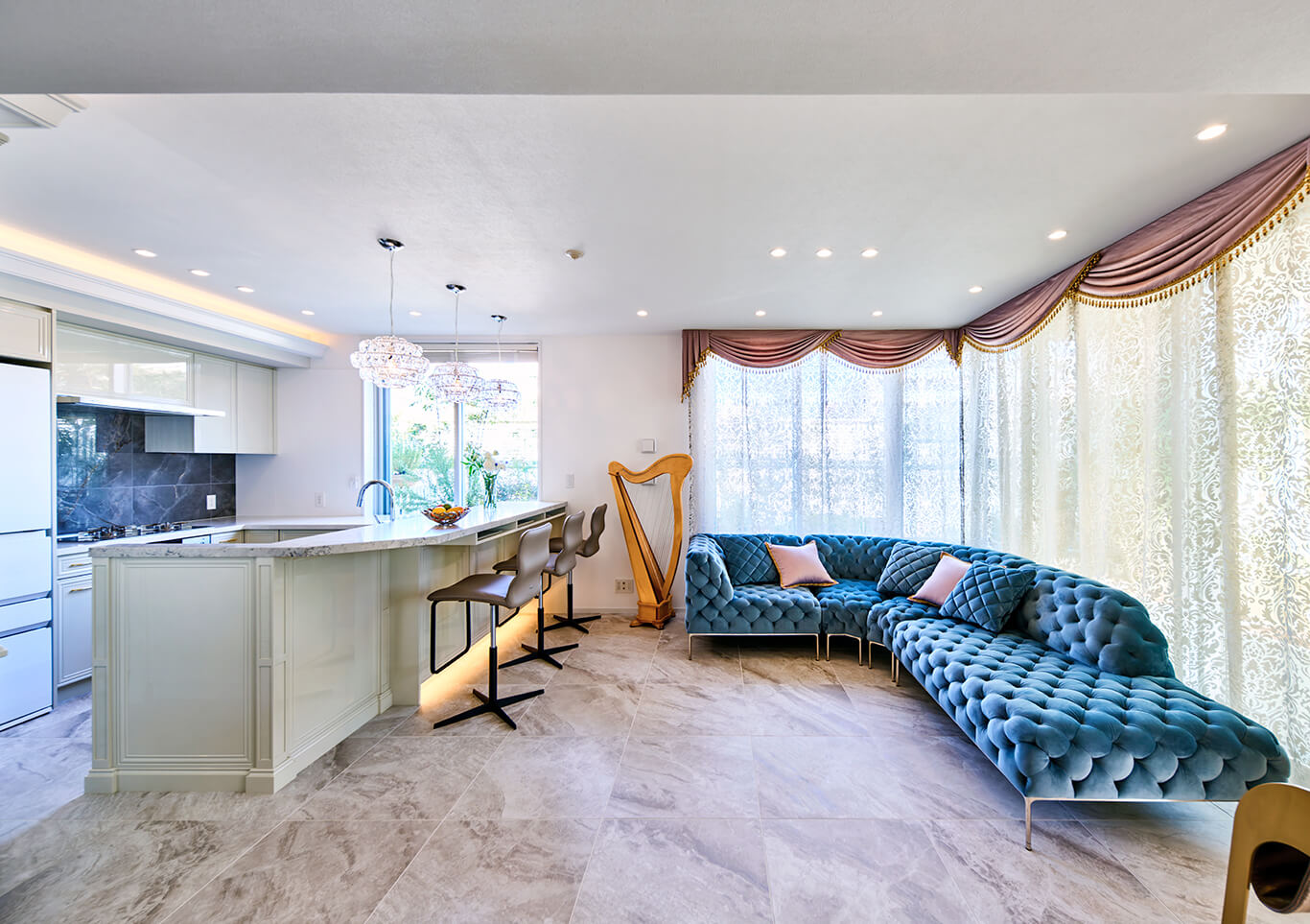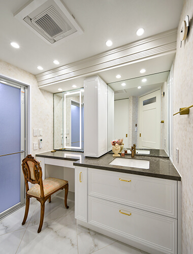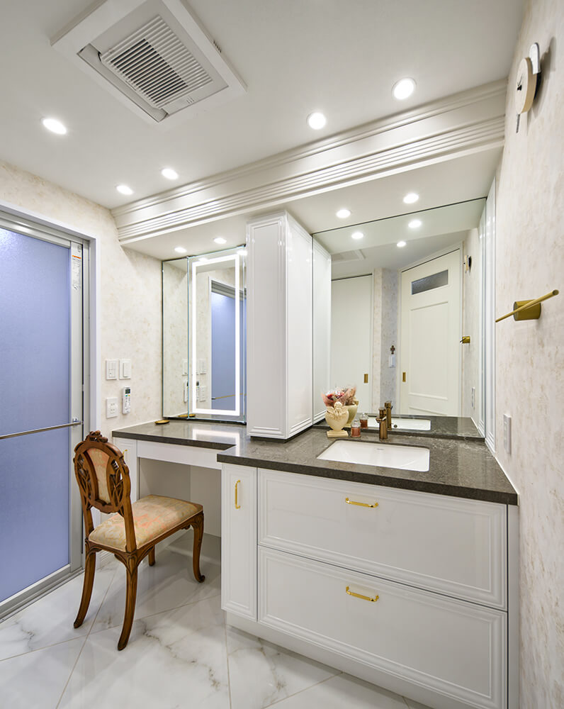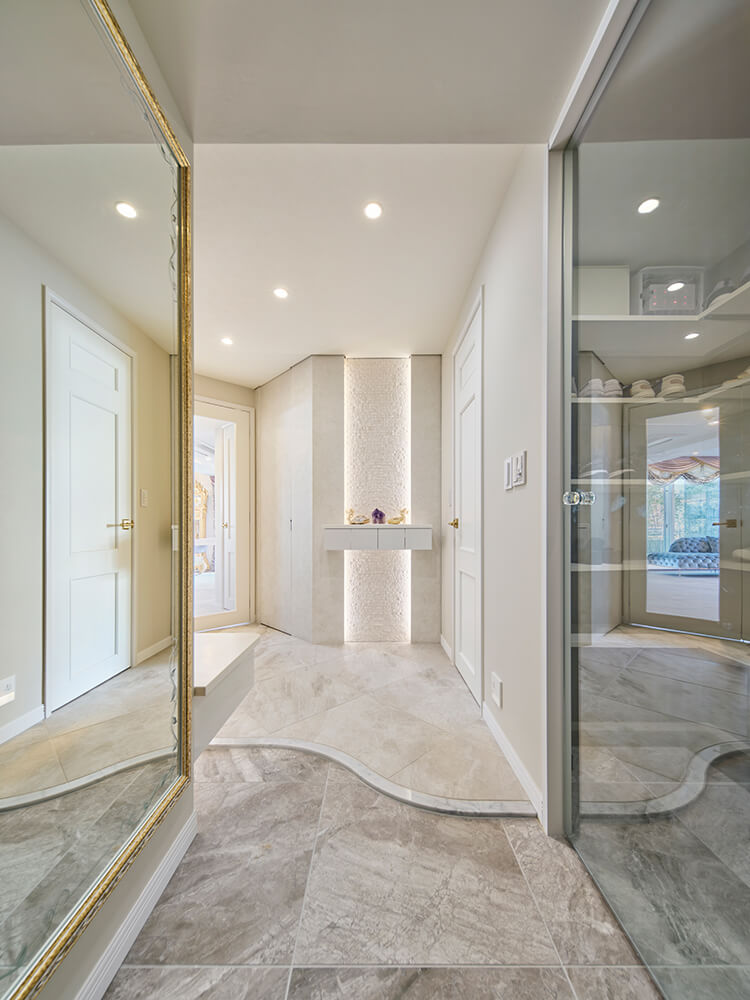 お施主様のライフスタイルに合わせ、スペースを余すことなく有効活用したリフォームプランです。 廊下を斜めに設けることで、玄関ホールからリビングの2面の開口へと視線が心地よく抜ける設計に。廊下スペースを最小限に抑えながら、リビング扉前の両側に収納を設け、ご要望の室配置を実現した動線計画です。 内装は当初シンプルモダンをベースに検討していましたが、打合せを重ねる中でクラシック要素を取り入れた上質なスタイルへ。お施主様の暮らしに寄り添い、天井は可能な限り高く確保し、奥様が長い時間を過ごされるキッチンやドレッシングルームはゆとりをもたせながら、清潔感のあるデザインで快適性を高めています。 また、愛犬との暮らしに配慮し、当初はフローリングを予定していましたが、弊社の事例をご覧いただき、ペットにも負担の少ないタイルへ変更。ご自宅での検証を経て採用いただきました。さらに、照明はスマートフォンで操作できるシステムを導入するなど、細やかなご要望一つひとつにもお応えし、こだわりと想いを丁寧に形にしたリフォーム事例です。