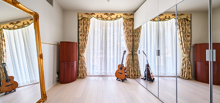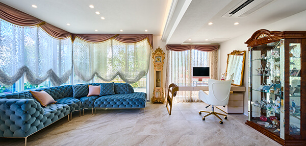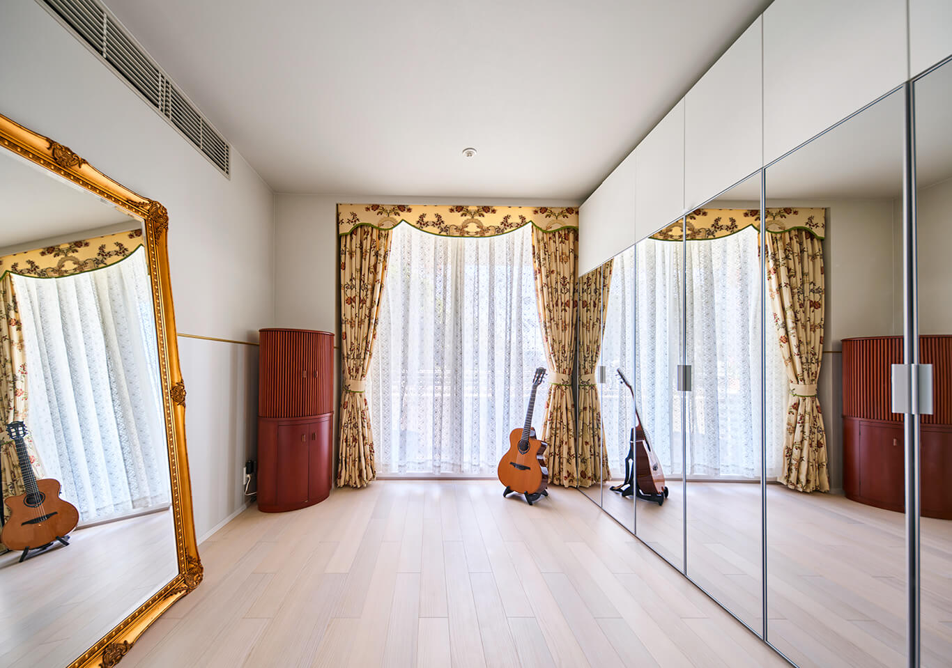 内装は当初シンプルモダンをベースに検討していましたが、打合せを重ねる中でクラシック要素を取り入れた上質なスタイルへ。お施主様の暮らしに寄り添い、天井は可能な限り高く確保し、奥様が長い時間を過ごされるキッチンやドレッシングルームはゆとりをもたせながら、清潔感のあるデザインで快適性を高めています。