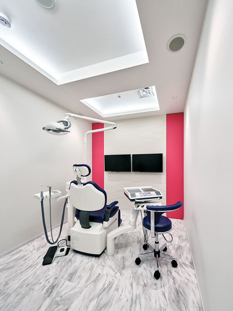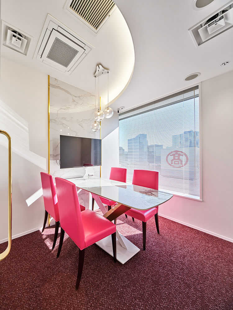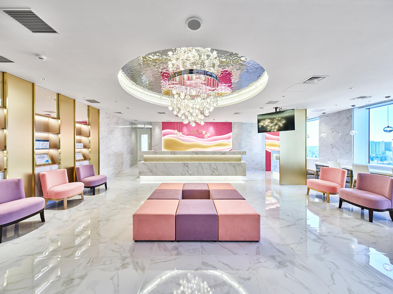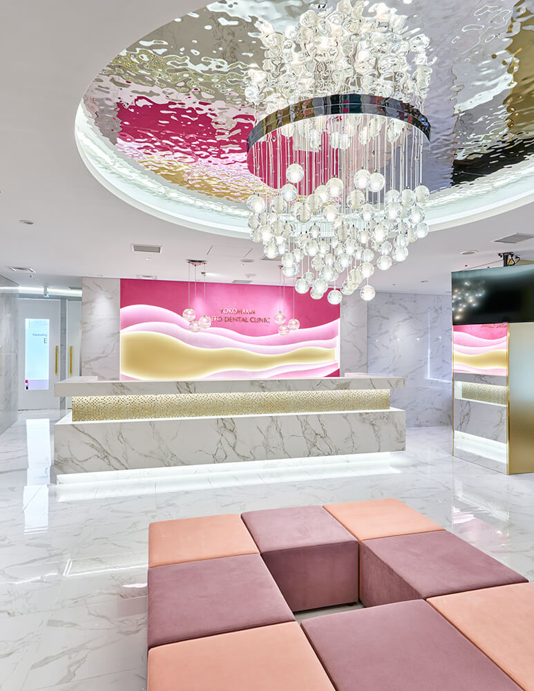 銀座・新宿、名古屋と各地でお受けしたデンタルクリニックリフォームに続き、4件目となるご依頼をいただきました。横浜という立地にちなみ、「海」をテーマにデザインしています。 待合室では、ステンレス板を張った円形の折り上げ天井が、水面のようなきらめきを放ち、雫を思わせるシャンデリアがやわらかく輝きます。 カウンター背面のアクセントウォールには、テーマカラーであるピンクとゴールドのグラデーションを施し、波のゆらぎを表現しました。 カウンセリングルームや診察室へと続く廊下は、清潔感あふれるホワイトで統一。ゆるやかな曲線を描く天井が穏やかな波打ち際を想起させ、空間全体で海の揺らぎを感じられる設計としています。 各地で展開されているクリニックのラグジュアリーなイメージを継承しながら、横浜らしさを織り込んだデザインに仕上げました。