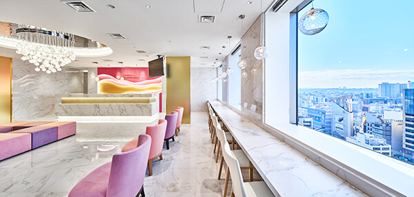 カウンター背面のアクセントウォールには、テーマカラーであるピンクとゴールドのグラデーションを施し、波のゆらぎを表現しました。